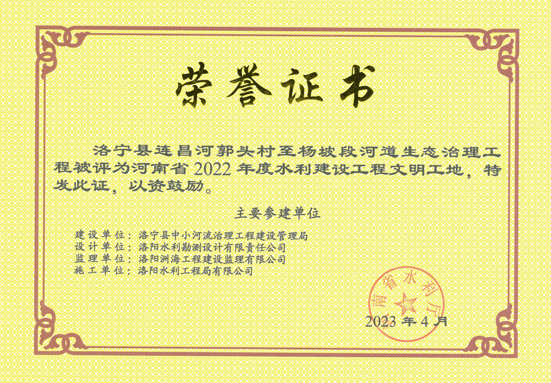 洛陽(yáng)水利工程局有限公司3個(gè)項(xiàng)目分別獲得省水利廳優(yōu)質(zhì)工程和文明工地的榮譽(yù)